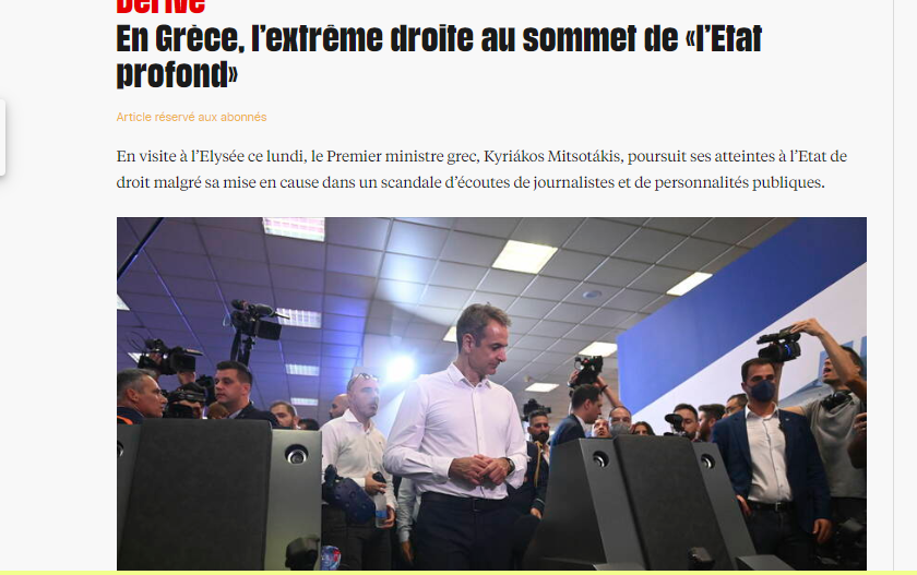 Συνεχίζεται ο διεθνής διασυρμός της κυβέρνησης Μητσοτάκη για το σκάνδαλο των υποκλοπών στην Ελλάδα. Σήμερα, με αφορμή την επίσκεψη του Κυριάκου Μητσοτάκη στο Παρίσι και τη συνάντησή του με τον Γάλλο πρόεδρο Εμανουέλ Μακρόν, είναι η σειρά της Liberation να αναδείξει την υπόθεση, φιλοξενώντας εκτενές ρεπορτάζ-κόλαφο με τίτλο «Στην Ελλάδα η ακροδεξιά είναι επικεφαλής του “βαθέος κράτους”».