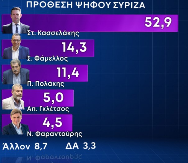 Οι δημοσκοπήσεις ομοφωνούν για επικράτηση Κασσελάκη στην κάλπη από τον πρώτο γύρο και με μεγάλη διαφορά, ιδιαιτέρως αν αναχθούν στο ποιοι εκλογείς προτίθενται πράγματι να ψηφίσουν (εξαιρουμένων απαντήσεων τύπου: κανέναν, δεν γνωρίζω κλπ) Εύγλωττο (ΙΙΙ).