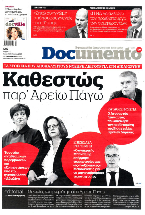 Αποκαλύψεις που θα βάλουν φωτιά στο πολιτικό σκηνικό φέρνει στο φως της δημοσιότητας η εφημερίδα “Documento” που θα κυκλοφορήσει αύριο 30/3, καθώς η εφημερίδα με αφορμή την υπόθεση των Τεμπών αποκαλύπτει στοιχεία που αποδεικνύουν τη “νοσηρή λειτουργία στη Δικαιοσύνη”.