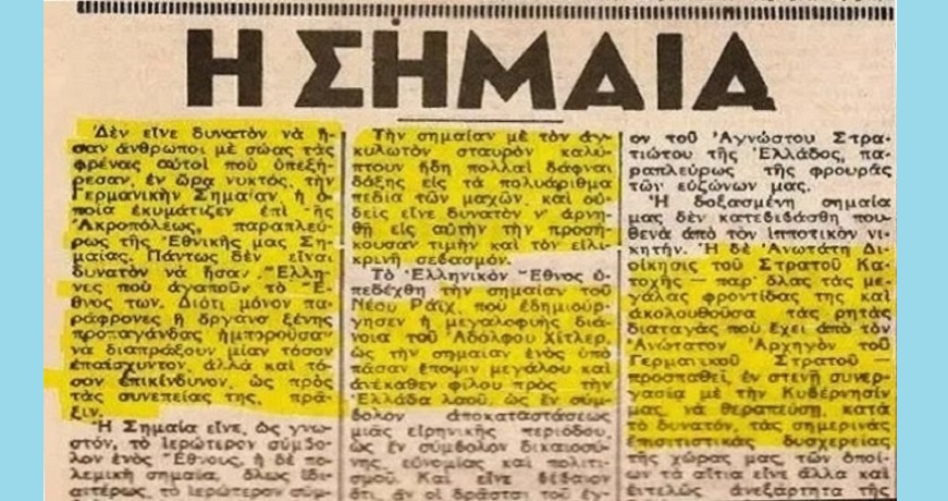 Η εφημερίδα «Βραδυνή» της 1ης Ιουνίου 1941 καταγγέλλει σαν «παράφρονες ή όργανα ξένης προπαγάνδας» αυτούς που κατέβασαν την χιτλερική σημαία η οποία αξίζει «την προσήκουσαν τιμήν και τον ειλικρινή σεβασμόν»…